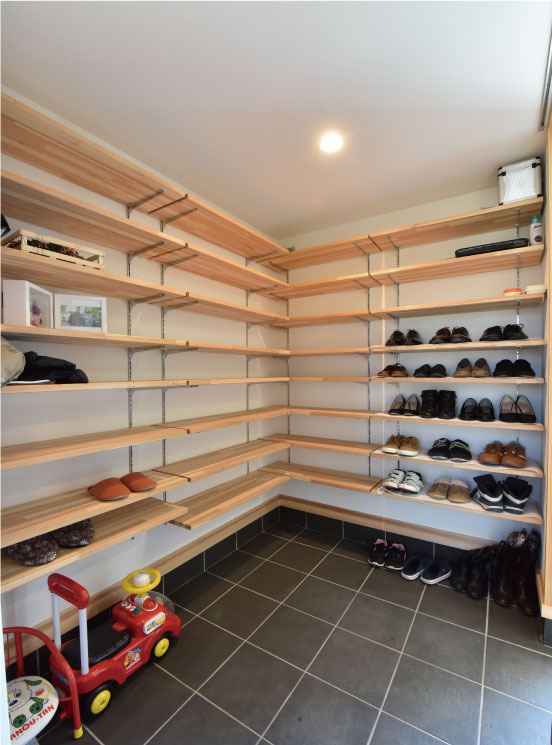 玄関横には大容量のシューズクローク・ランドリー収納などお片付けスペースはしっかりと確保する施主様の素敵なアイデアです。